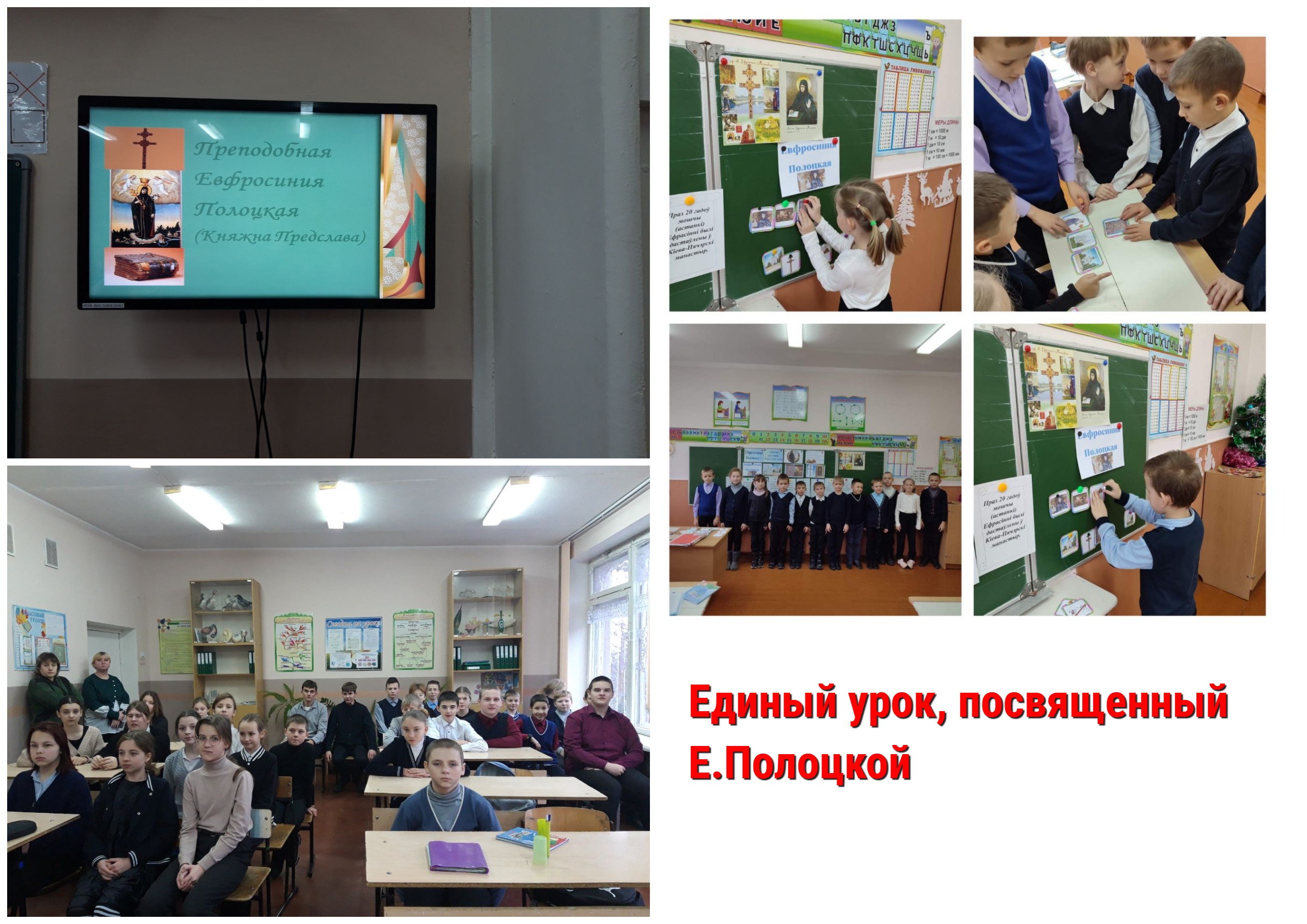 Единый урок, посвященный жизни и деятельности просветительницы, покровительницы земли белорусской Евфросинии Полоцкой прошел в нашей школе 20 декабря. В рамках урока учащимся рассказали о значении личности Евфросинии Полоцкой для Беларуси, а также о ее духовном наследии и просветительской деятельности.